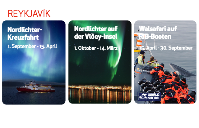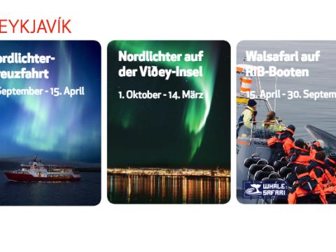 Elding Whale Watching bietet die bekanntesten Walbeoachtungs- und Meeresabenteur-Touren in Island. Mit Jahrzehntelanger Erfahrung bieten wir das ganze Jahr über verantwortungsbewusste Walbeobachtungstouren an. Unsere Angebote schließen auch exklusive Touren ein sowie die Fähre zur Insel Viðey. Darüber hinaus gibt es saisonale Touren. Im Sommer bieten wir Papageitaucher- und Angel-Touren an, und im Winter Touren Nordlichter-Kreuzfahrten und „Imagine Peace Tower“-Touren.