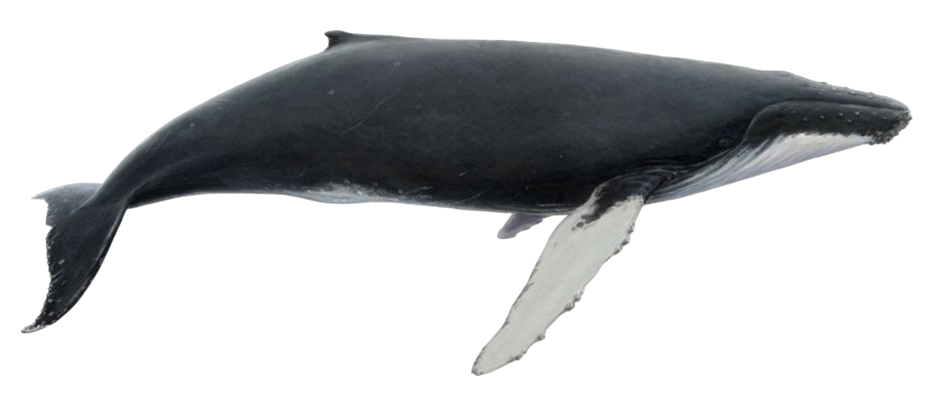 Characteristics: 13-17 metres, black body, bumps on head and jaw, long white pectoral fins, barnacles