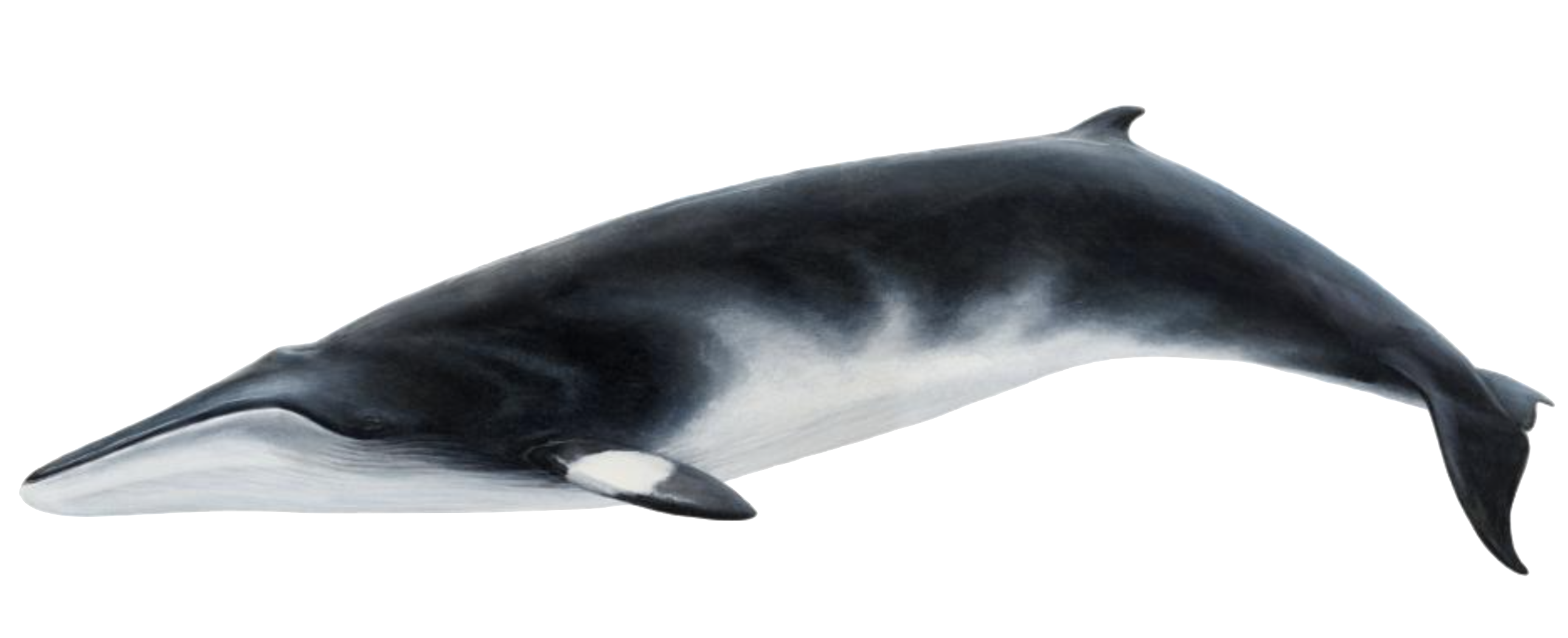 Characteristics: 7-11 metres ,streamlined body, white patch on pectoral fins, pointy snout
