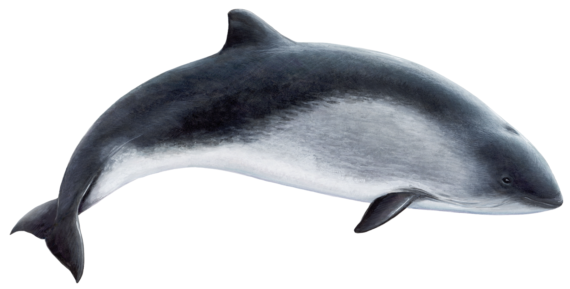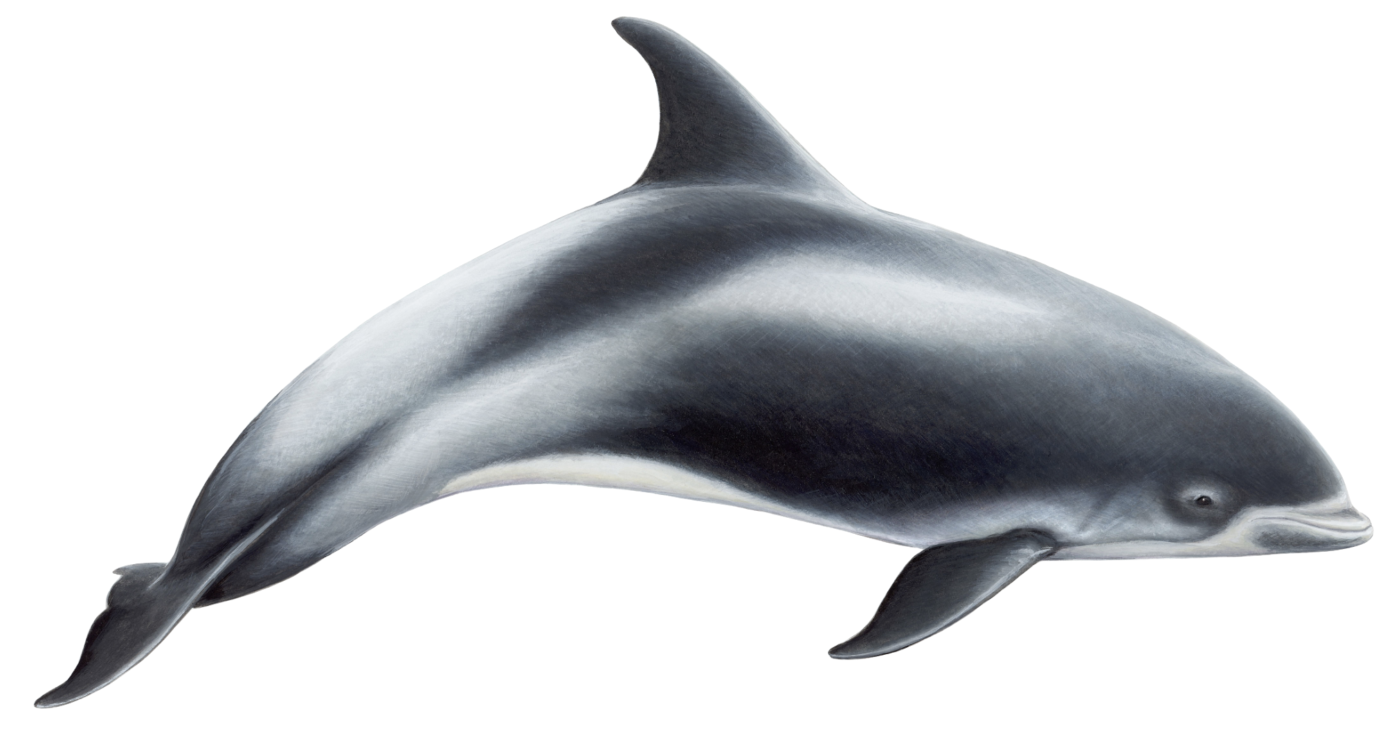 Characteristics: 1,5-2 metres, often confused with dolphins, dark gray on back but lighter on the underside