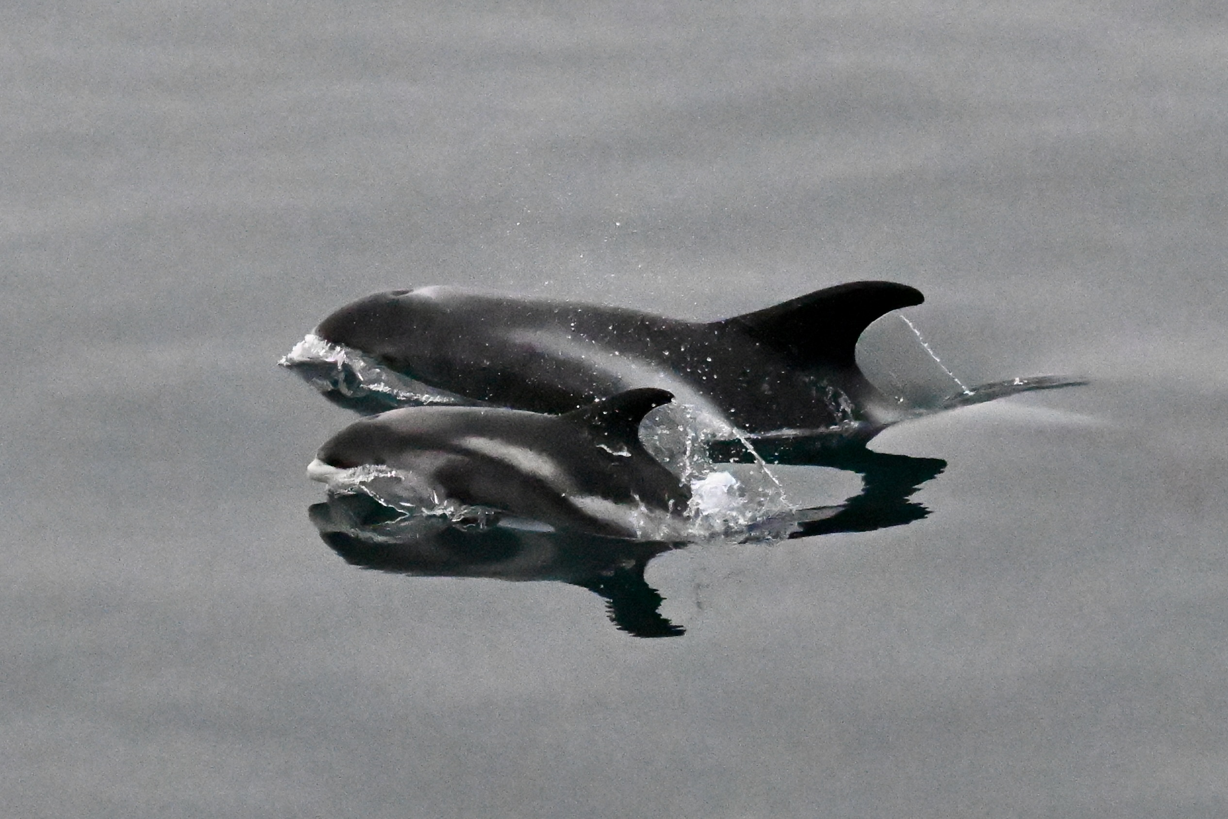 Report from Eldey: Today the snow made the visibility close to Reykjavik a bit challenging, but the very flat seas helped! We first started going around Videy island due to the recent sightings, where we ended up finding the beloved 2 humpback whales that decided to spend their winter holidays in Faxaflói! Banana and Radar (now we have a name for it!) were very calm, taking their time on the surface and not spending a long time under. A couple of times, they treated us by popping up very close to our vessel, allowing us to see their details up close! Then, we decided to go a bit further, and we spotted a big head of a harbour seal looking at us with a seagull friend next to it. Not far from there, we spotted a couple of dorsal fins! When we got closer to check them out, we saw we had 4 white-beaked dolphins, 2 mommas and 2 babies! They were not alone, though: a few seconds after seeing them, we also realized our surroundings were full of fins! About 30 more dolphins were around, some of them jumping like crazy, others feeding... We stayed mostly with the babies, since one of them was also showing off giving some very cute leaps! We couldn't get enough of it! However, it was time to say goodbye and we started our way back home. What a lovely tour it was!