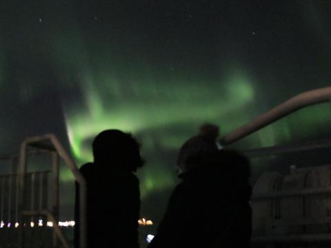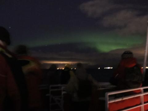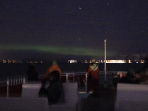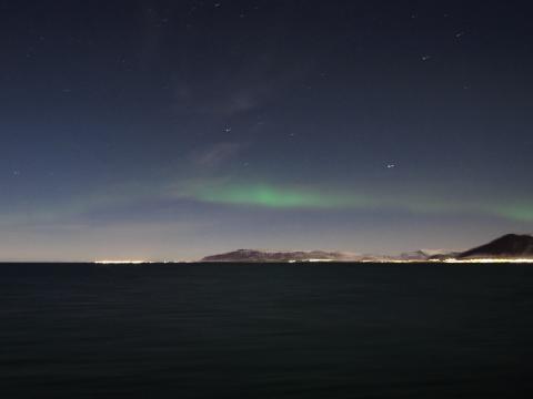 Report from Eldey: What a star filled sky we had tonight. Absolutely lovely clear skies and, as soon as we sailed out, a green arch just above Mt Esja. It was a faint arch, but visible for the naked eye for a good first 15 minute