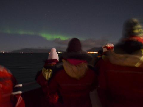 Report from Eldey: The conditions tonight were fantastic for northern lights! Everyone kept warm and cozy in the complimentary overalls on board, while we sailed through the cold and strong northerly winds and choppy seas. While we waited for
