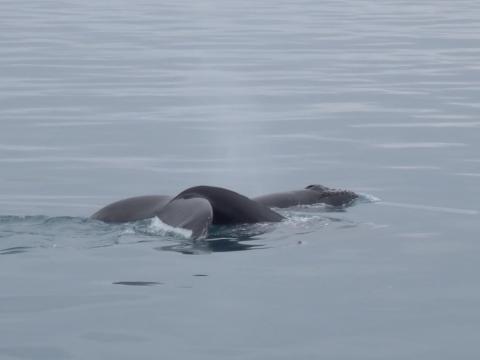 Report from Elding: It was fully cloudy but the sea was perfectly calm, great weather for whale spotting! We sailed out for about an hour and found some splashes in the distance, and as we approached, we realized we had about 15-20