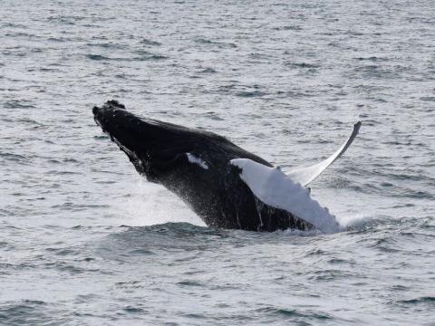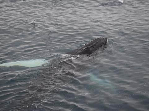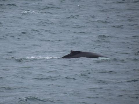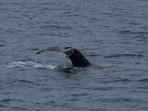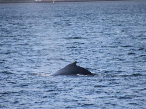 Report from Elding: A warm but cloudy evening whale watching tour marked the perfect ending to the day. The sea was slightly rough but our tough passengers payed no mind. another vessel was out on the bay and called us to let us know of a