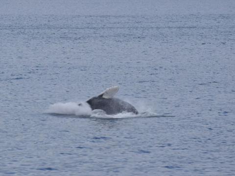 Report from Eldey: The conditions we saw in the afternoon had calmed down a lot, swell height was low and visibility was great! Moving towards our main sighting area we spotted some water splashes from a distance, which was later conf