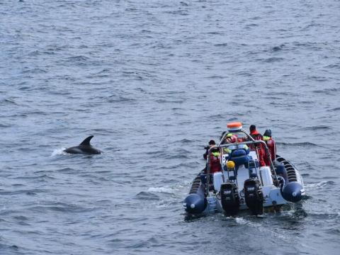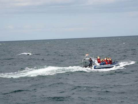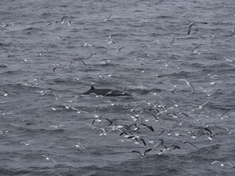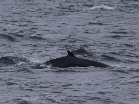 Report from Eldey: The last tour today was also the most fun tour today. After about one hour of sailing, a minke whale popped up just 150 m away from us! We slowed down to spend some time with this animal, and our patience was rewarded ve