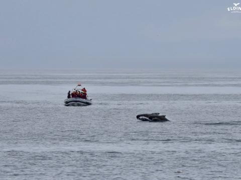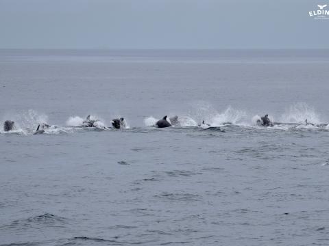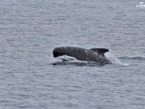 The long-finned pilot whale mainly stays in the deep waters feeding on squid however in July 2012 we observed this species for some days. The first day was a bit unsettling as they were stranding on the beach of Njarðvík so our whale watching tour turned into a bit of a rescue mission to try and get in between the whales and the land and push them back out to sea. Last time this happened was at Þorlákshöfn in 1986 where around 100 animals were found dead on the beach.