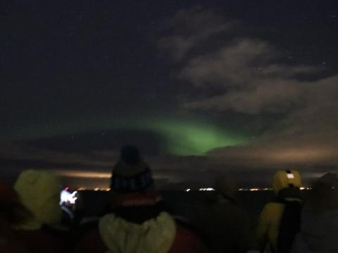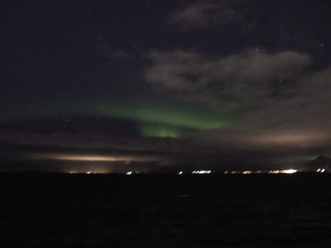 Report from Eldey: Friday 13th is considered an unlucky day, but gladly, it didn't apply to the night time. The only inconvenience was microphone cracking down due to cold and that small problem was solved fast. At 21:00 we left harbour under dark sky covered only with stars what always gives us the optimal conditions to see aurora. One hour later we slowly stared to see a pale green arch making it's way through the sky. After few more minutes of waiting it become brighter, soon second line appeared under the first one and we had a beautiful display of green lights visible for naked eye and lasting for next half an hour. When they fainted it was almost a time for us to go home. As night was beautiful with clear sky, we waited a bit longer hoping for a second chance and when it was getting really late with a nice music in the background we made our way to the harbour.
