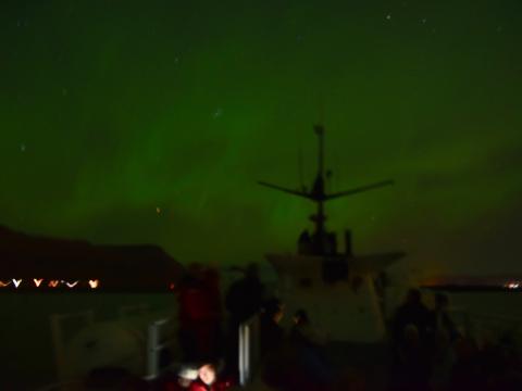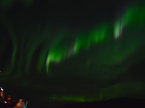 Report from Eldey: It as no surprise that tonight is going to be a good night, considering that the lights were already visible from the harbour. Calm sea, no wind, not a cold night, clear skies... ... and then this. The sky was on fire! Everywhere we looked there was green, white and even purple dancing above us. It was the brightest for the first maybe 30 minutes of the tour, but it stayed with us the whole time on sea. This was for sure one of those things that you can never forget.