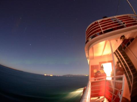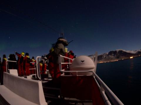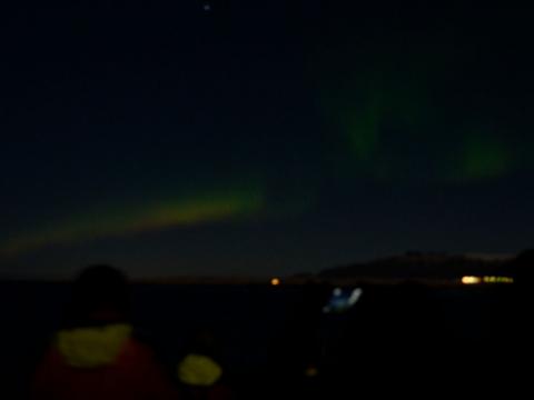 Report from Eldey: This night cruise was a beautiful start in the new year. On the top deck everyone was welcomed by a light breeze and a clear sky. And only after about 20min, when we sailed by the island Videy, we already spotted faint activity spanning from the sea to the mountain range Esja, forming a beautiful arc. During our tour this activity increased and decreased sometimes within seconds, which appeared as the dancing green northern lights on the dark night sky. Changing shape and colours from green to yellow also let us forget about the cold temperatures and let us enjoy the natural phenomenon in this cristall clear winter night.
