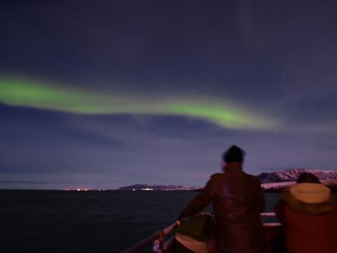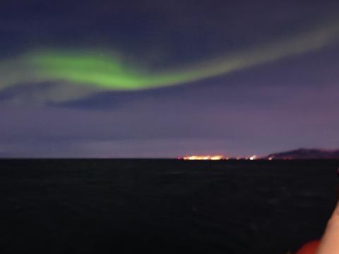 Report from Eldey and Hafsulan: A bitterly cold, yet calm night in Reykjavik. Ideal for us to be going out on two boats tonight. We had a thin veil of high clouds in the sky, but all around there were clear patches and stars glistening even through the clouds. With the winds being rather strong tonight, we decided to seek shelter close to Mt Esja, a beautiful sight this time of the year as, due to the snow covering it, it is even visible in the night. Also the night scenery of Reykjavik and the mountains and lit up skifield behind it is incomparable. So enjoying this scenery, warming up with hot chocolates inbetween, we waited patiently for the lights to show themselves. It was nearly 2 hours into our tour when, seemingly out of nowhere, a green arch appeared! It became bright really fast, for some seconds a second arch appeared, and just as fast as it had started, everything fainted to a more dim green. Just as we began to head back, surpriiiise, a double green arch, bending and moving further to the north than before. Absolutly splendid. The lights kept us awake tonight, moving in and out as they came and went, but one place they will surely stay is in our memories.