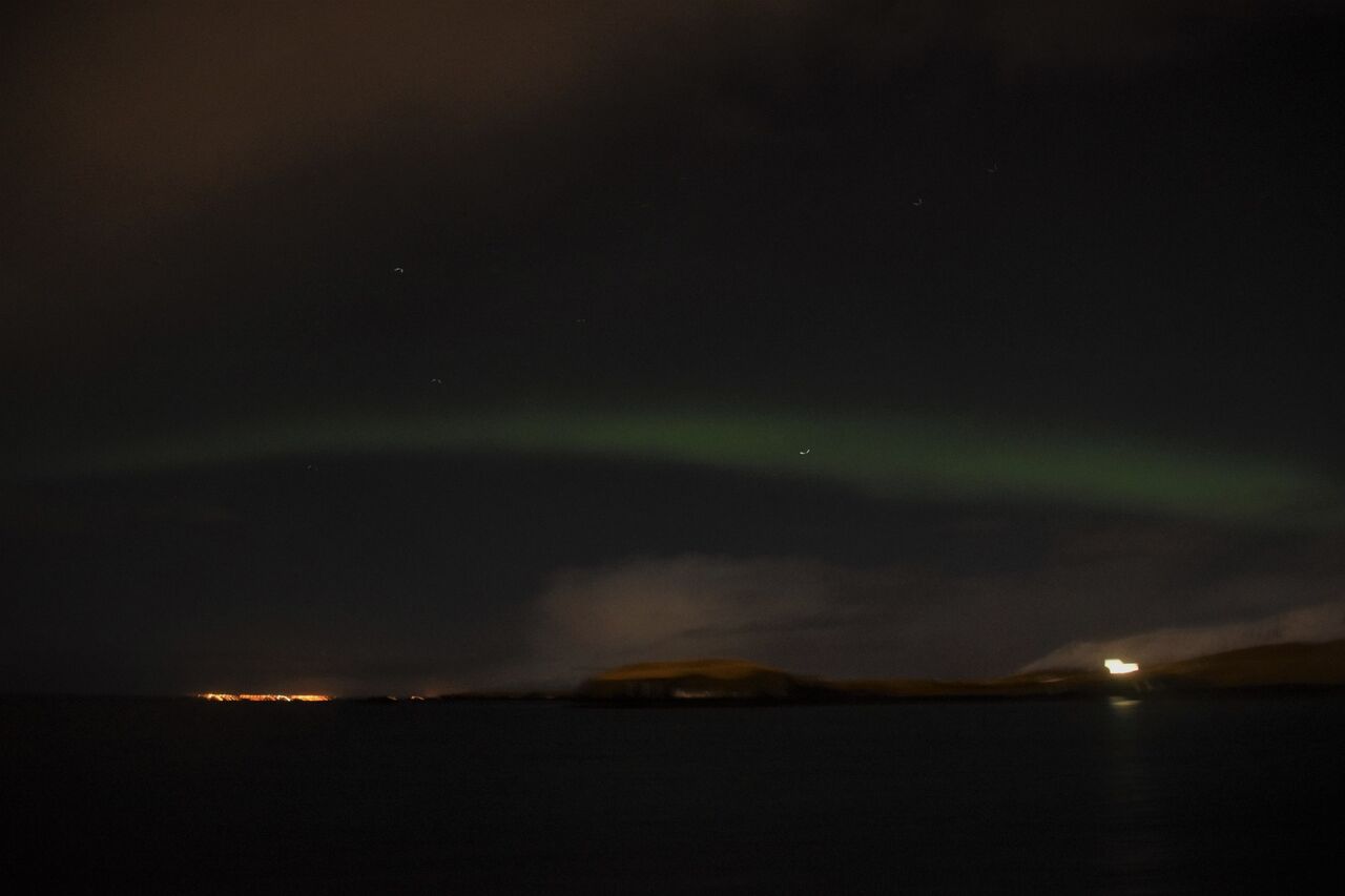 Report from Eldey: It was a lovely night even if the weather was bit difficult. There was no wind and sea was calm. It was almost perfect but few clouds which were passing by bring us short snow-falls lasting couple minutes each. We had nice patches of clear sky giving us chances to see lights. We were waiting with patience when finally some lights appeared on the screens of camera. Unfortunately another cloud came and cover it. In our disappointment we start heading back. But then finally our wishes came true: green arch raised above sky! It was enough strong to see it with naked eyes! As the show last short and we were hoping for more, we offered complimentary tickets.