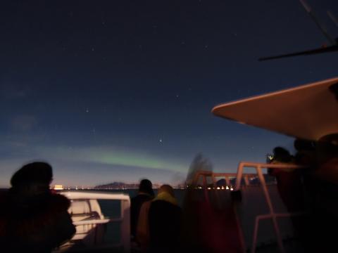 Report from Eldey: What a star filled sky we had tonight. Absolutely lovely clear skies and, as soon as we sailed out, a green arch just above Mt Esja. It was a faint arch, but visible for the naked eye for a good first 15 minutes of our tour. Sadly, they soon began fading and dissappeared out of the sky and even out of our cameras. But with such a clear sky and promising forecast, we remained stubborn and optimistic for them to brighten up later on in the evening. Using all the time of our tour, we waited patiently, warming up with addictively good hot chocolate inbetween, but remained without more of the lights showing. While we are happy we at least could have our passengers experience some light activity, we definitely wish to show them better. So complimentary tickets were handed out and with these everyone is eligible for a free return northern lights tour in the coming two years.