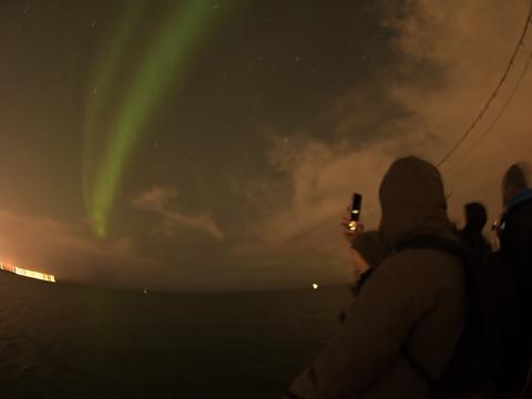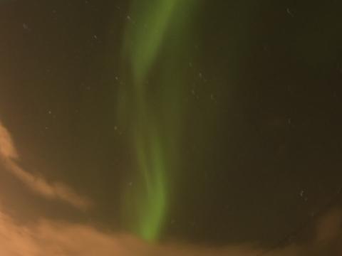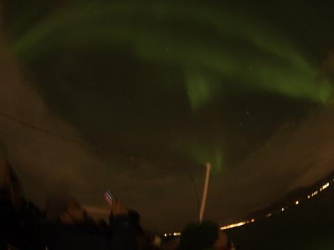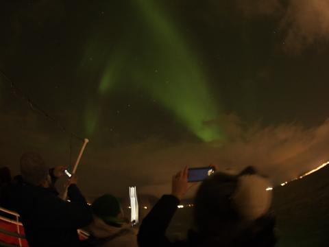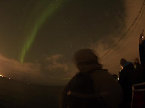 Report from Eldey: We were on the verge of cancelling our tour this evening but we took a chance and we were sooooooooooo glad we did. We started our tour with clear beautiful starry skies and a strong illumination from the Imagine Peace Tower. A very faint arch to the north was captured on the camera but difficult to see with the naked eye. It started to get a little easier to see but still very faint. Suddenly the clouds came over and the rain started our 150 passengers went inside to get warm and eat a waffle served at our onboard cafetia. The clouds came and went and just as we were about to turn home the skies cleared again and the northern lights shone and danced over head. Many streaks filled the sky and everyone was gasping with enjoyment. Sometimes its definitly worth taking a chance and when those chances pay off it an incredible feeling.