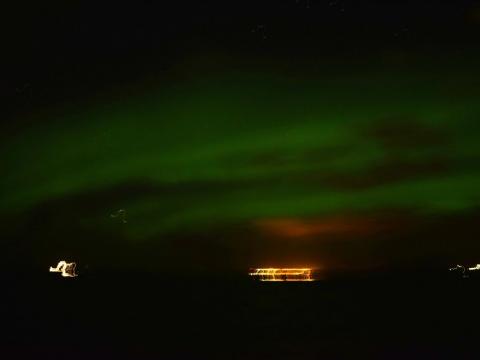 Report from Eldey: The sea had been nice and flat all day and continued to be that way tonight. We only had a little bit of long swell and a few clouds spread across the sky. It took a little while for the northern lights to get started but around 23 o'clock (11 pm), they started to get really bright and even dance in the sky. They weakened and got stronger again, spreading across most of the sky. Absolutely amazing how they just keep moving and dancing.