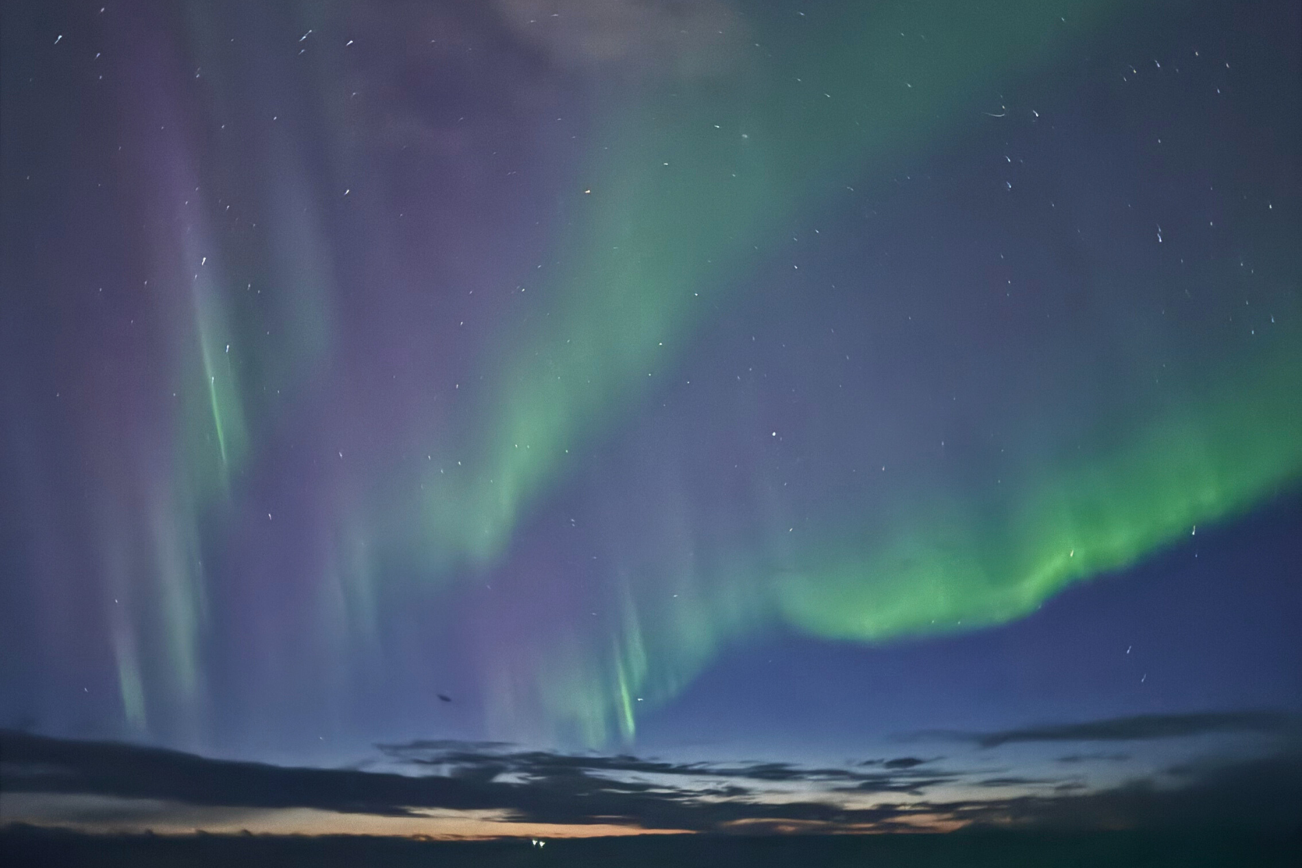 Report from Eldey: It might be Friday 13th, but since we're not superstitious, just a little stitious, we went out in search of some nice aurora borealis! As we birthed from Reykjavík, a small and faint glow appeared in the West and also in the North. Soon enough it got brighter and greener and purplier, it was Northern Lights!! Everyone was already out since I announced it as soon as I picked up the green on my pictures and everybody could see the green lady coming out. We stayed between the islands of the capital in near darkness, enjoying the amazing arch it formed and filled the sky and our hearts.