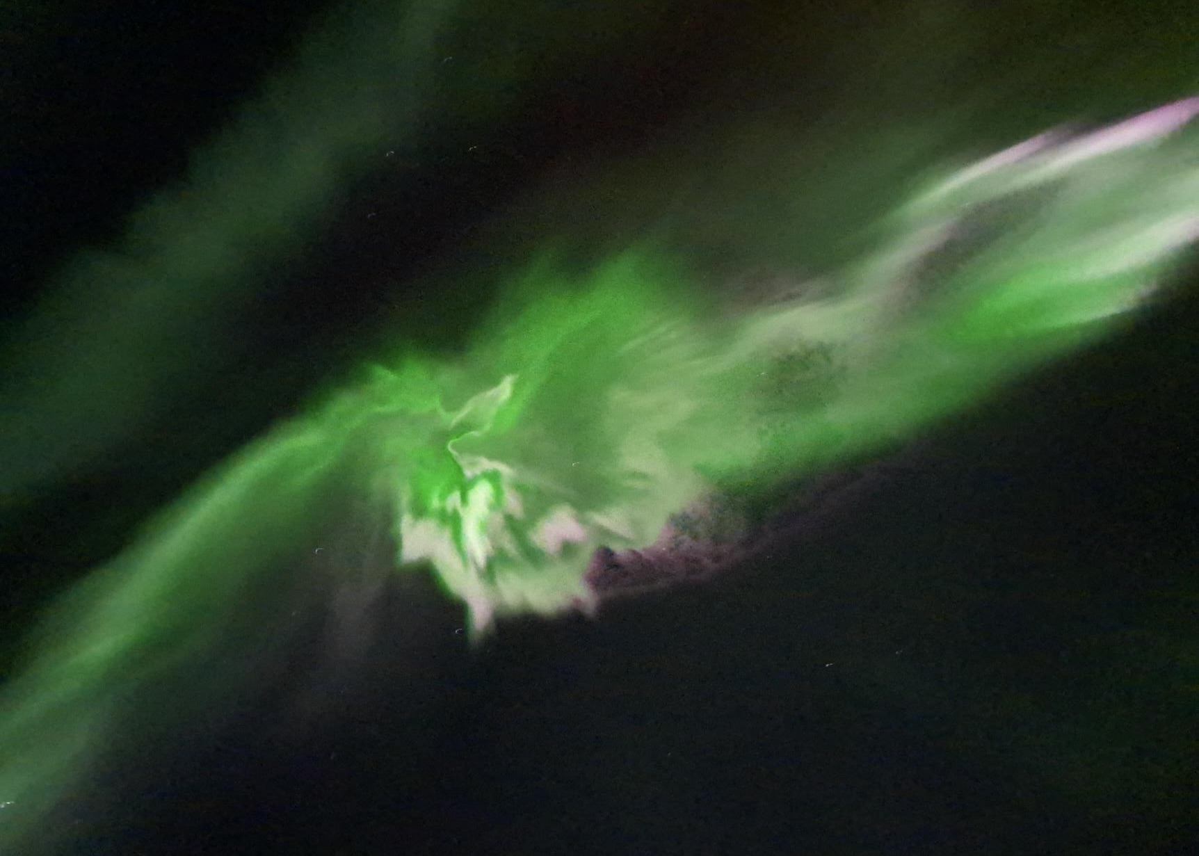Report from Eldey: The Aurora was out in full force as we left the harbor. Amazing dancing arcs and loops all over the sky. It was just amazing. For a short time the intensity decreased but then the northern lights came back and allowed for more awesome pictures. Truly an unforgettable night out on the bay.