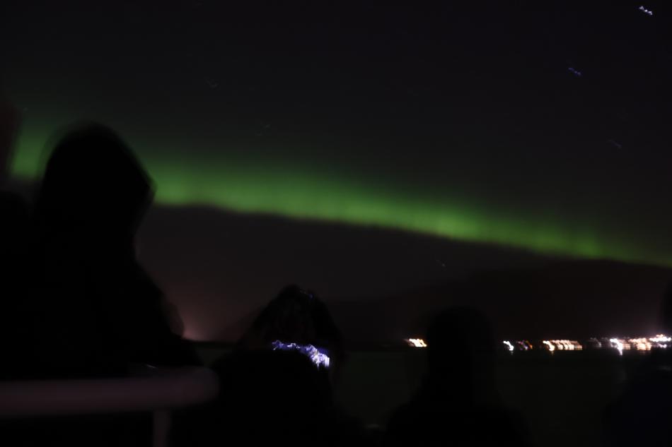 Report from Eldey: With a heart full of hope and a cup full of hot chocolate, we ventured into the darkness of the bay that bathes the shores of Reykjavík to try to spot the lovely aurora. The sea was calm and in it, we could almost see the reflection of the starry sky that we had above our heads! A few minutes after the safety speech a very dim light started to appear on top of Esja and as the playlist progressed the Northern Lights were more and more intense! We saw an arch forming above us and going towards the sea horizon, which lasted the whole tour. It did a few shapes, a few whisps and even broke down in some bits. A lovely evening was spent on board our lovely vessel.