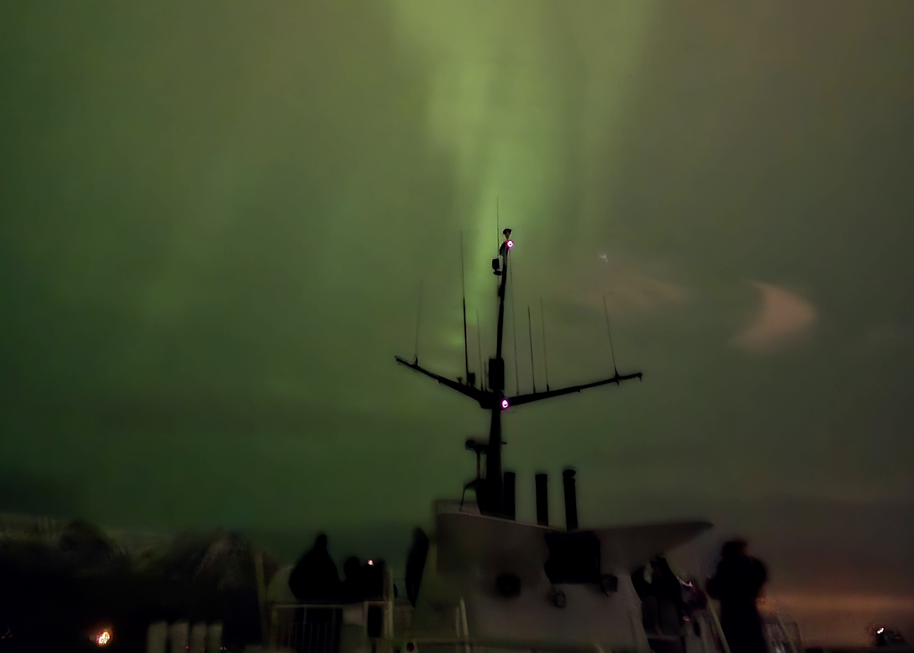 Report from Eldey: We sailed out into a windy bay this evening, with quite some cloud cover overhead. About half an hour in though, the clouds above mount Esja started to glow up, as northern lights started to shine through. It was hard to make out with the naked eye, but a picture made it clear they were present. At the same time, a gap opened up in the cloud cover right above us, leaving only some thin high clouds. Some time later, the northern lights moved up a bit and appeared perfectly within the gap above us! While the high clouds made them look a bit more diffuse, they were still very bright, moving and dancing above us: One band turned into many and we saw many shapes form and go for almost an hour! The stars aligned this evening as a seemingly perfect coordination between northern lights and clouds made it possible for us to enjoy a great spectacle!