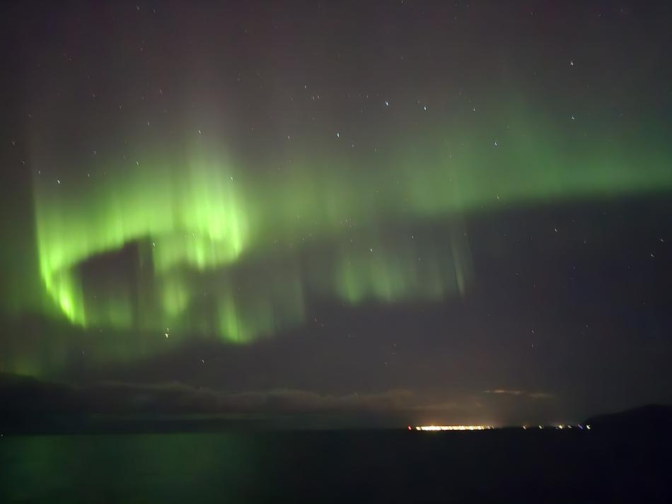 We headed out with a good prediction of the northern lights and were very pleased to see them, as soon as we were out of the harbor. They were on our left hand side and were shining green. So everyone was out from basically the first minute of the 2 hour tour. The northern lights stayed with us the whole tour and were green and red. They appeared as arches and they were also slightly dancing. Everyone had great views of them, because they surrounded us. We had a very good tour and lots of happy faces !
