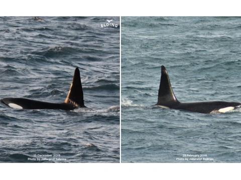 Our research team just positively identified the male orca we encountered in Faxaflói bay last weekend as the same individual that we encountered in a similar area earlier this year! Interestingly enough, on 28 February the male was seen travelling with another male, but it seems to have returned on 15 December with a juvenile, a female and her calf!