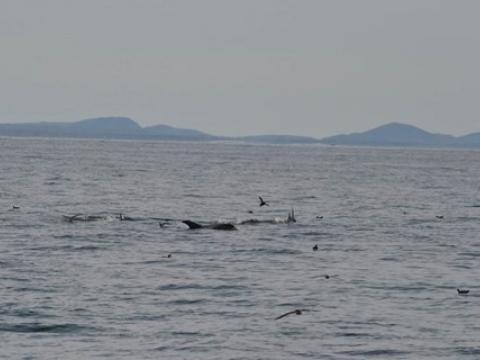 Report from Hafsúlan: The days fantastic weather didn´t stop on a packed boat this afternoon, we were still blessed with sunshine and calm seas. The normal amount of time is takes to spot an animal is 45 minutes and after exactly 45 minutes we had our first sighting, white-Beaked Dolphins. This was a pod of 5 individuals that were slowly moving though the area, though they weren´t jumping or leaping their slow movement in the sunlight was still a great sight. After some time we moved on in order to find something larger, and we end up finding 4 larger things! They were all minke whales, our most common species in the bay. The first was an elusive one that didn´t show itself very often, the second was the best as it was very visible swimming slowly close to the boat acting very relaxed around us. The third and fourth were actually a pair that were feeding together, we had seen a large group of birds feeding and decided to investigate. It was great to see a pair together surrounded by a huge flock of gulls and puffins. And our sail back would give us all a chance to sunbathe and get a real Icelandic tan.