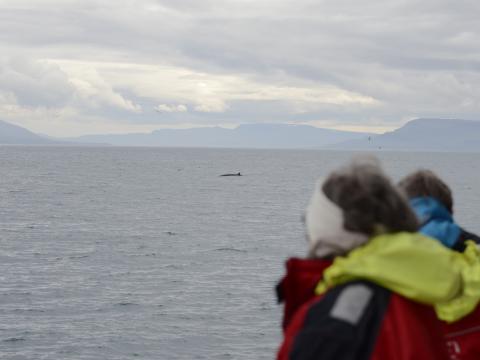 Report from Elding: The conditions from the morning stayed the same so we could be confident of more success this afternoon. Just like on the last tour our first sighting was of a pod of white-beaked dolphins, this one was around 6-7 individuals large and was travelling slowly through the water. We followed them as they slowly travelled close the the vessel for around 15 minutes. They were very calm and unlike on most days, easy to take pictures of! We later moved on and found a pair of minke whales feeding, but they seemed to be feeding deep under water and spent very little time at the surface. This wasn't great for watching so we left and found a second pair of minke whales! In this pair there was, just like in the morning, a great minke whale named Háski who was once again giving us a really nice tour. After a lot of nice sightings of Háski and the second whale we began to head back and found another pod of dolphins with an individual which we also know, a dolphin named Sophie. On our way back to Reykjavík we saw 3-4 more whales in the distance too, the bay was full of life today!