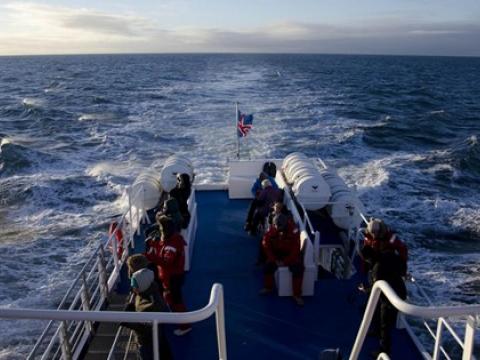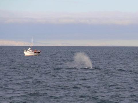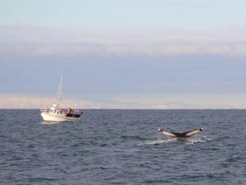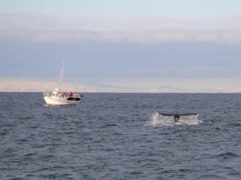 Tour at 13:00 Report from Elding. Once again it was beautiful day out on the sea. As we were leaving the harbour in Sandgerði we could already see flocks of feeding seabirds which, are always a very good sign and they were. Just like the last two days it only took us about 10 minutes of leaving the harbour before we saw our first whale. A Humpback Whale feeding close to the small icelandic fishing boats. We watched for a while and saw it bring it´s fluke (tail) above the water a couple of times. Whilst we were watching this individual we could see another whale´s blow or spout further out and as there were al lot of fishing boats and another whale watching boat near to this individual we decided to head out to see what whale was the one further offshore. Another Humpback Whale, it turned out to be, and this one we had to be a bit more patient because it did longer dives but still a very nice humpie. All in all another fantastic day out from Sandgerði.