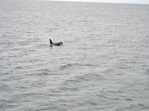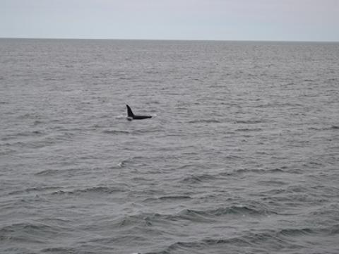 Report from Hafsúlan: This time we sailed out from Grindavík. We had our hopes high for this tour as the captain and the engineer spotted a pod of orca on the way from Reykjavík to Grindavík when they were moving the boat. We went straight to that area they saw the whales but no luck there. We searched in a very large area, sailed pass Gunnuhver, a hot spring very close to the shore, and other beautiful cliffs with the ocean hitting the cliffs. After about 2 1/2 hours of searching we were nearly giving up hope when suddenly a very large black dorsal fin popped up very close to us! We had two orcas just next to us! One of them swam away but the other one stayed with us. It was like it was checking us out. Surfacing right in front of us, under the boat and up again! This was truly amazing experience with this magnificent animal.