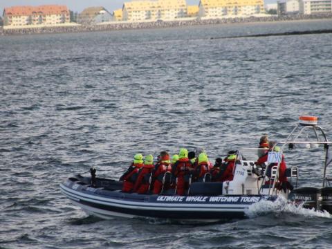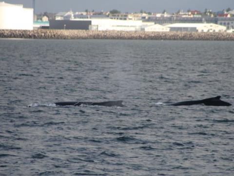 Report from Elding: This tour was very different. Instead of us finding the whales, we were found by them. It took us almost 2 hours to spot the first sign of a whale. We saw the sickle-shaped dorsal fin of a minke whale. Unfortunately, this minke whale was very elusive and we could only see it two more times in some distance to our vessel before it disappeared. Unsatisfied with this sighting we had to turn the vessel to sail back home as we were very far out in the bay. But then we were surprised by a minke whale popping up right in front of us. It surfaced 3 times in less then 10 m to our boat giving the few people which resisted rain and wind the great chance to see this animal very close. But the even bigger surprise was awaiting us close to the harbour - a pair of humpback whales. Just a few minutes before we reached the harbour we saw two big blows coming up from the water surface. This couple was obviously waiting for us. Even the sun came out and everyone got to enjoy these beautiful giants surfacing slowly only 50 m away from the boat. A tour starting slowly but with a finish to remember!!!