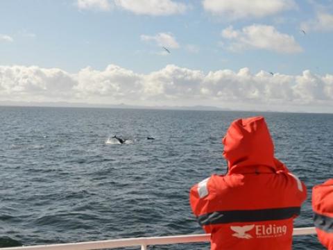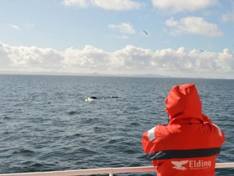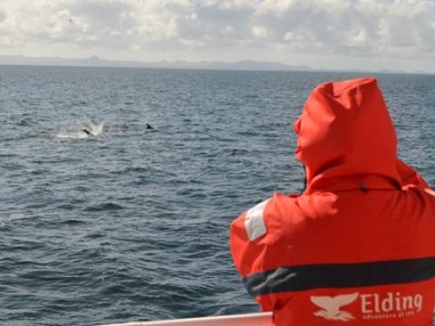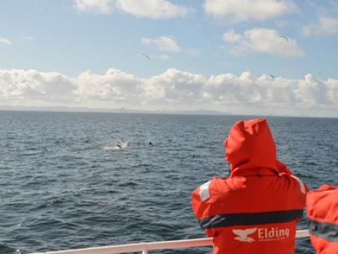Report from Hafsúlan: There was a black cloud over us this morning showering heavy rain as we headed out of the harbour, but if passengers didn´t believe the Icelandic joke ´if you don´t like the weather, just wait 5 minutes´they do now. Just 5 minutes sailing the skies cleared and we had beautiful sunshine the rest of the way. After about 40-50 minutes of sailing on a calm sea we saw our first Minke Whale, surfacing many times giving our passengers plenty of opportunities for pictures. After spending about 20-30 minutes with this minke we saw another in the distance and spent another 20-30 with that one too. Soon we were seeing blows and black backs surfacing in the distance to. We found ourselves the jackpot of the bay, seabirds started to form large flocks to feed and two pods of White-beaked Dolphins of 7-9 in the first and 3-4 in the second showed up too. They were fantastic, best dolphins we have seen in a while. Surfacing very close, even playing around us and what was really incredible is that were leaping and breaching out of the water just 20-30m from our boat. Usually a behaviour seen at a distance. The tour was just incredible. The weather, landscape, birds and the whales combined made this a trip to remember.