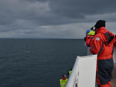 Report from Hafsúlan: We headed into the wind and a little bit of rain when we went to the area where we saw the animals in the trips before. The amazing gannets we saw plunge feeding continued with their spectacle together with White-beaked Dolphins (5-9) jumping out of the water. And in that same area we discovered at least 3 different Minke Whales, feeding around the boat in different directions and distances. With so much action going on all around the boat it was difficult to decide where to go and what to watch! We watched the dolphins for a while and then continued on to watch the different minke whales a bit more closely. One of them surfaced right in front of our boat and gave us a very nice look before heading further. The gannets were still plunging into the water all around us and made it difficult to leave - it was almost raining gannets! Right as we were about to turn around to head back into the harbour we discovered the dolphins were jumping again. We got another great look - especially at one individual repeatedly leaping and breaching. On the way back we enjoyed the last few rays of sun and 2 more Minkes and around 4 Harbour Porpoises (additional to the 3-5 on the way out). What an amazing end to an incredible day of whale watching!