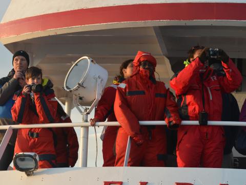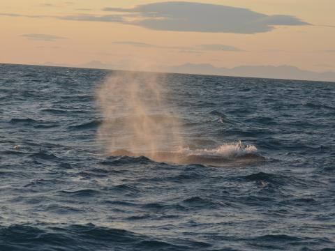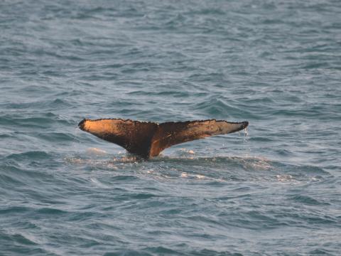 Report from Elding: The sea conditions were getting pretty rough on this evening tour but the humpback whale we spotted completely made up for any roughness from the ocean! The humpback didnðt seem to mind us and just continued feeding and came close to our boat a couple of times. We spent all our time with the humpback and on the way back the winds picked up so much that I almost lost my hat a couple of times. I'm very proud of our passengers who took it all in stride and got a lot of good pictures of the fluke (tail) of the humpback. Man green and happy faces when we entered the harbour after an adventurous trip.