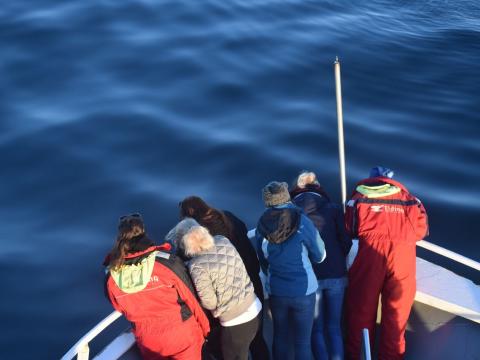 Report from Hafsulan: You would think that the day should not be able to get better after our previous tour, but it did! The weather remained calm, warm and sunny with the only slight difference that the sun was starting to set, giving a dusk atmosphere to the bay. Quickly we spotted in the distance a tall blow, that originated from a large minke whale that surfaced close to us twice before disappearing out of sight. After losing this minke we went further out to spot a pod of 10-14 white-beaked dolphins that displayed a far less shy behaviour than the previous encounter. Some of them were staying quite far from us, dashing through the sea surface and feeding, but few of them were following us from the side, surfacing nice and slow, giving us plenty of opportunities for nice pictures. They even came less than 2 meters from the boat, you had to lean overboard to be able to see them! After staying long time with those dolphins, we had the opportunity to sight a second minke whale, also more cooperative than the first one but also a lot smaller! It was an adorable encounter that kept us in awe before it was time to go home.