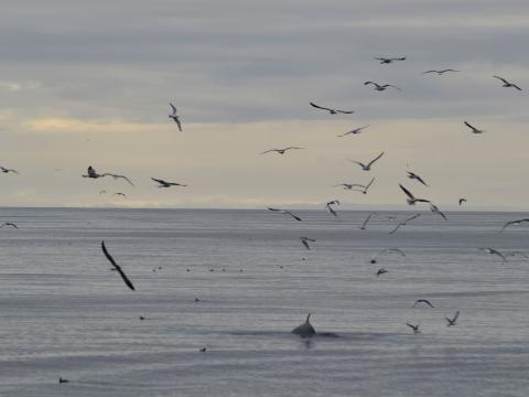Report from Eldey: The fog had really cleared up by this evening, meaning that we had a great view of Mount Esja as we left the harbour. Just past the lighthouse we saw our first pod of 5 white-beaked dolphins. They didn't seem too keen to stick around though so we moved on and were soon surrounded by minke whales. The minkes were coming up left, right and centre, it was so difficult to keep track. At one point it was possible to just pick any side of the boat and you were almost guaranteed that a minke would pop up! On our way to a giant flock of birds, some friendly harbour porpoises turned up and swam close to the boat. One even breached! Just before we returned to port we had an amazing encounter with 7 white-beaked dolphins, which stayed with the boat for a while. There were two calves in the pod that were very excited and continued to breach for us, it was adorable. It was honestly a fantastic trip!