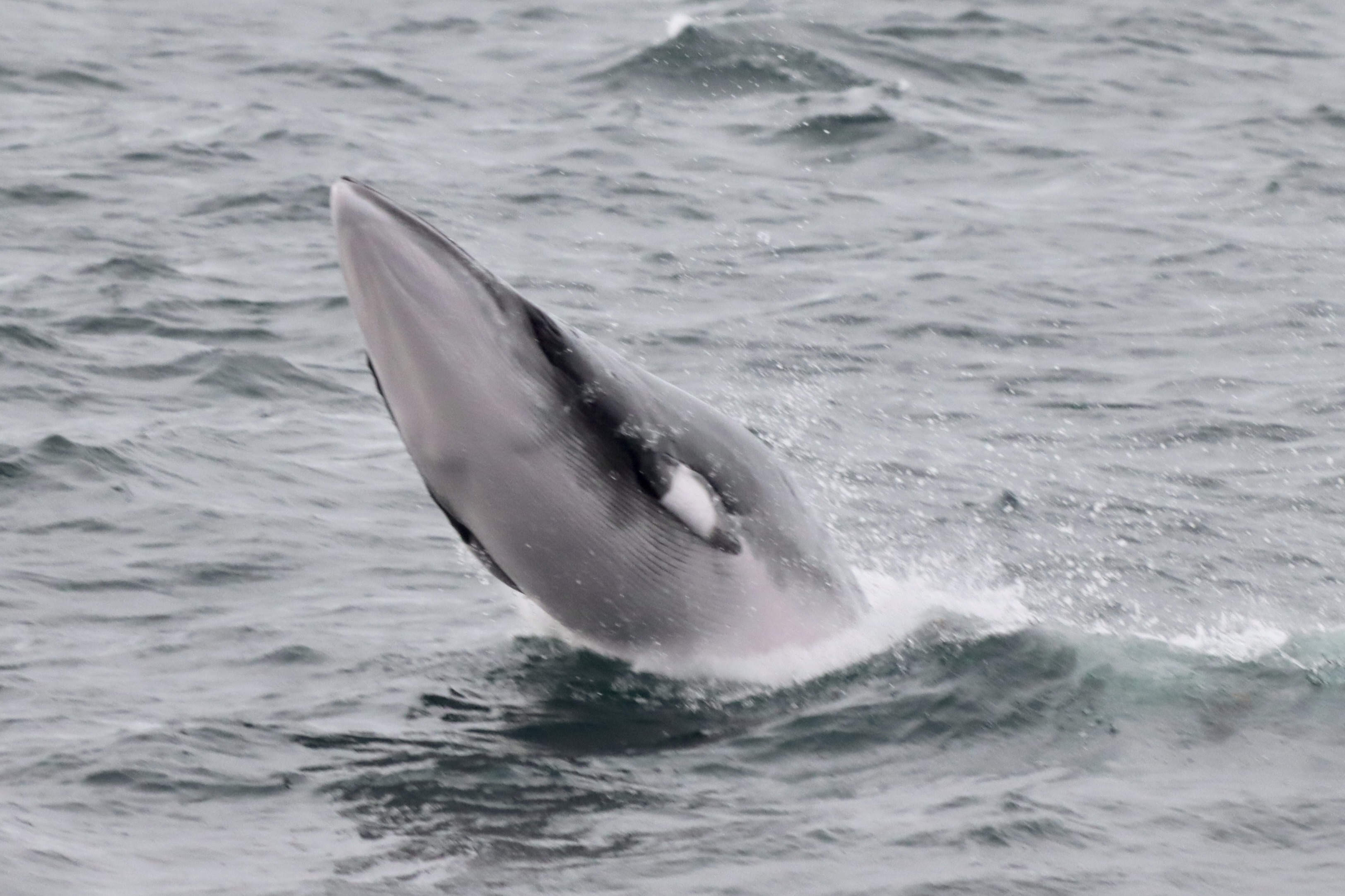 Report from Eldey: Both winds and waves had picked up a bit as we sailed out again this afternoon. We spent some time searching until we spotted a distant blow. This blow belonged to a very shy humpback whale, which dove down for long times and moved at a high speed. While we were trying our best to keep track of this humpback, a Minke whale swifty swam by as well, passing right in front of our boat! We eventually gave up on the humpback and moved on to a distant splash, but once again we were unlucky as the whale it belonged to seemingly had disappeared. But then our luck turned around fast as towards Reykjavik we could see a humpback whale leaping out the water over and over! We set course towards this individual immediately and the whole way there it kept breaching, each time a little bit closer. Even when we reached the whale it still was beaching continuously, only takes brakes to perform pec slaps, sometimes lifting up both pectoral fins high up at the same time! As the whale eventually seemed to calm down, time ran out for us as well. We continued towards town, appreciating this spectacular encounter even more as it proved how we can never tell what to expect and tour can take the most unexpected, amazing turns!