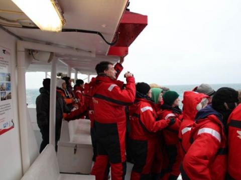 Tour at 13:00 Report from Hafsúlan: Today we sailed out from Hafnarfjörður, it was pretty windy with a little bit of rain but the ocean wasn't so bad at all ! We sailed in the Hafnarfjord area for a while but then decided to head to Reykjavik or Faxaflói bay. There we found three pods of White-beaked dolphins that were hunting, they were moving very quickly but started playing around the boat at the end, jumping up, swimming very close to the surface beside the boat and then under it ! As always, the White-beaked dolphins were beautiful and so much fun to watch ! We also saw a small Ruddy Turnstone that was trying to land on our boat, it was probobly lost out on the sea and trying to find it's way back ! The weather was better than expected and it was wonderful seeing about 8-12 dolphins, so this was a very good tour ! Birds seen on todays tour included: Fulmars, Cormorants, Eider Ducks, Kittiwakes, Glaucous Gulls, Razorbolls, Black-backed Gulld and Shags