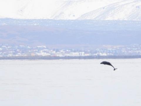 While we were enjoying to watch the porpoises and the Minke Whale, a second Minke showed up on the other side of the boat. Suddenly, one of our passengers spotted a group of 4 White-beaked Dolphins in 700 meters distance, so we decided to leave the porpoises alone with the Minke to meet the dolphins - a meeting which we thoroughly enjoyed. When we were heading back to Reykjavik, we were happy to see another couple of Minke Whales and we were positively surprised by another group of 5 to 6 >White-beaked Dolphins jumping very high and again bow-riding the front wave of our boat - the cherry on the cake on this amazing afternoon tour.