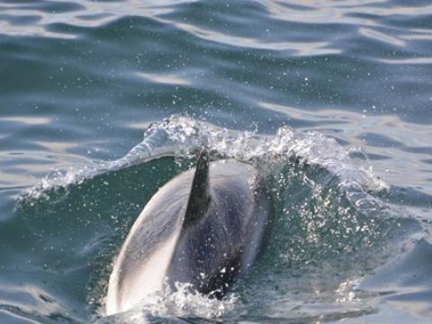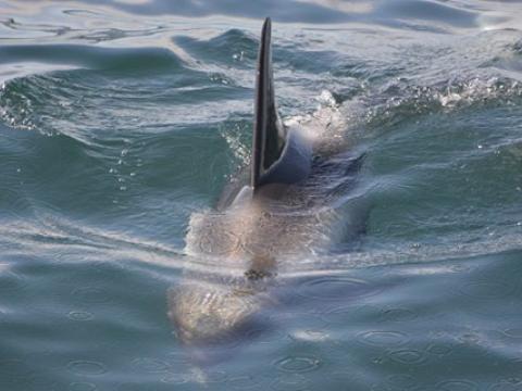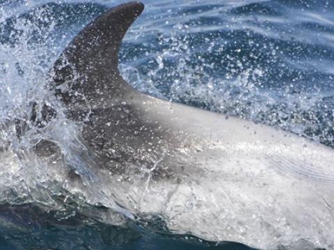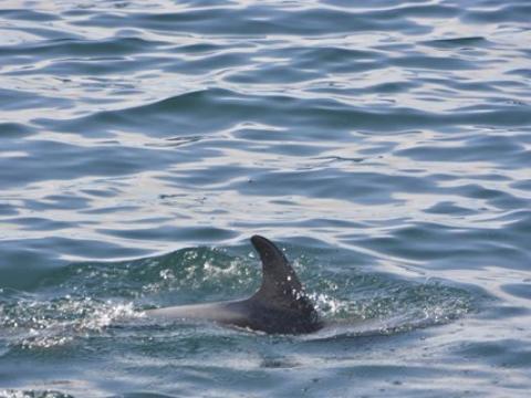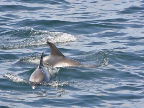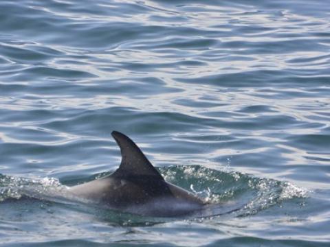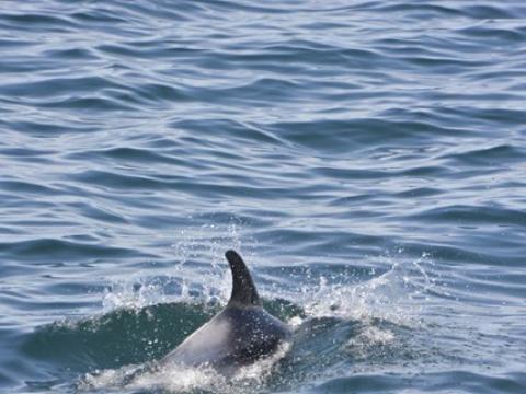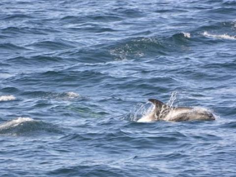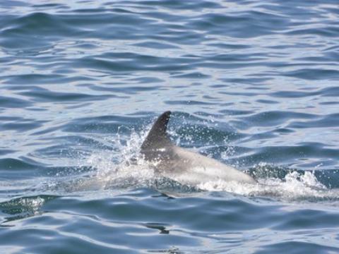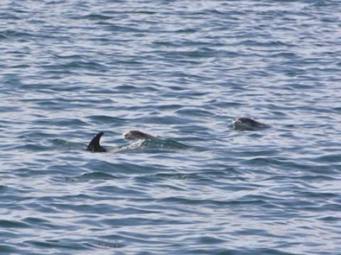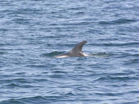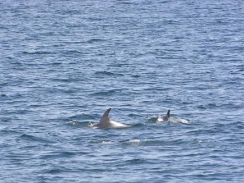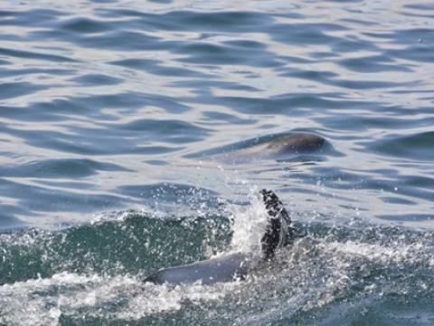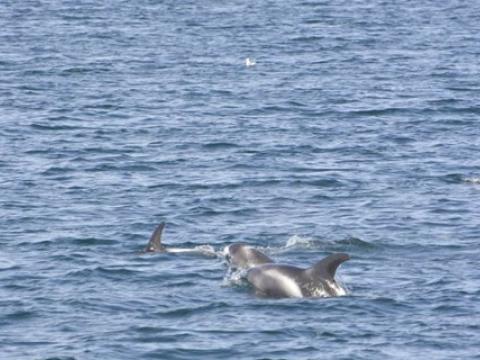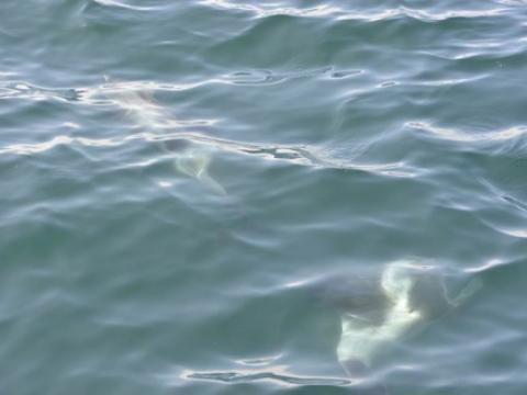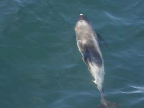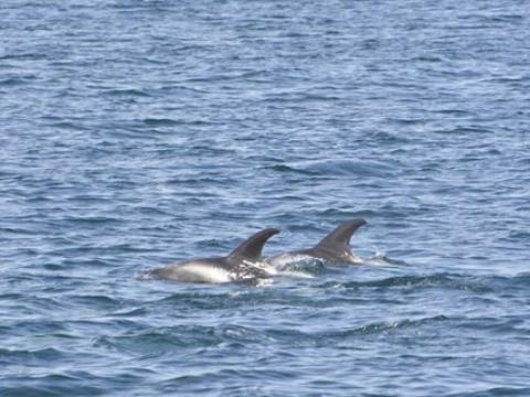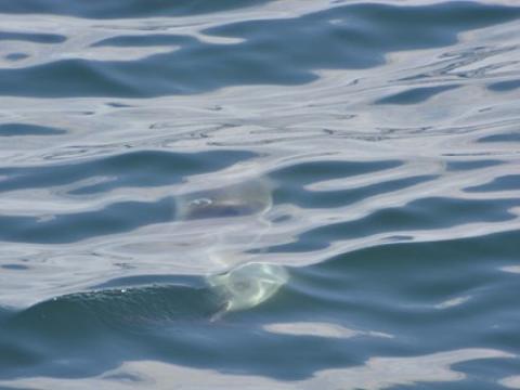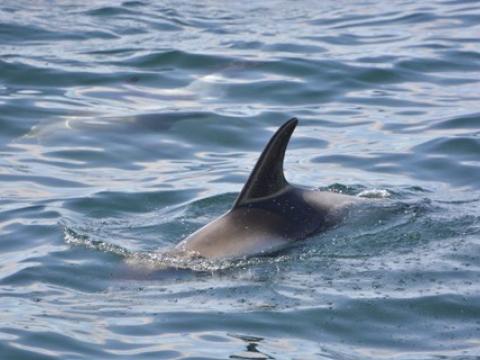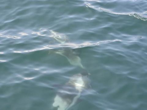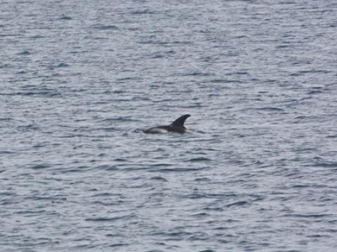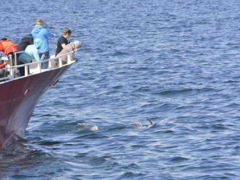 Report from Hafsúlan: Warm temperature and sunshine welcomed us, so that the overalls were not that much needed on this tour. We sailed out into the calm bay where we soon found two pods of White-Beaked Dolphins which have been splashing, bowriding, surfing our waves, leaping and something which looked liked "human watching", as they came to check out every boat which newly came into the observation zone. The people at the bow could look into the eye of a dolphin which was observing us as we observed them. There were around 7-11 individuals, some of them younger ones. One, out of 4 curious individuals - which often came very close to the boats - had a white scarring over its left shoulder. After a while we left the dolphins to find 2 Minke Whales which we could see well and our way back we came once more across the same playful dolphins as before, being sure there were the same recognizing the scarred one. We were looking at all the characteristic features as their white and black body pattern was nicely visible under and out of water, their short white beaks, their bulky bodies, their big sickle shaped individually formed dorsal fins and so on. A very nice encounter indeed!