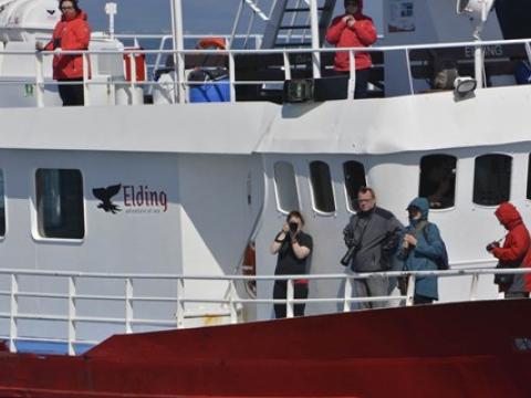 Report from Elding: The weather was just beautiful this afternoon and after only about 30 minutes sail we spotted two pods of 6-8 White-beaked dolphins. One of the pods were very playful and curious as they swam right up to the boat and swam with it so we could get an amazing close up look at the animals, they were so close that we could almost touch them ! We enjoyed these amazingly friendly dolphins for quite some time and when their curiosity ran out we headed to a different area. In our search we spotted 2 Minke whales, but both of the animals were hard to track and took long deep dives, but we still managed to get a good look at them. There seemed to be alot of food in the bay and we could see flocks of feeding birds spreaded around the area. The tour was very good in a nice Icelandic summer weather, but we think that the dolphins were definately the highlight of the tour!- Freydís Ósk