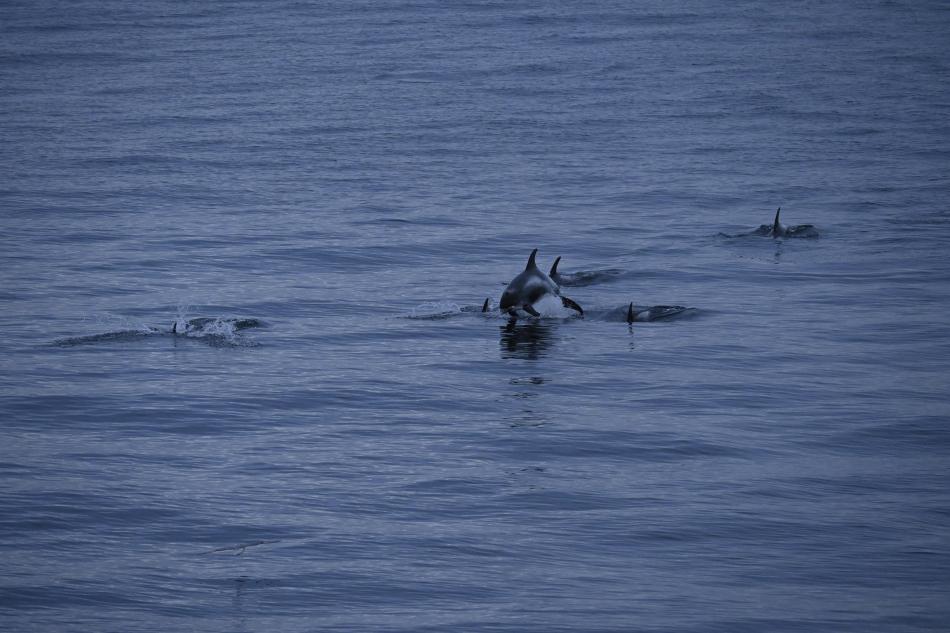 Report from Eldey: Imagine flat seas, high clouds and the first snow resting on the mountain peaks surrounding the bay. This was the seting for what was about to become an incredible evening of whale watching. During the tour, we spotted at least 10 different minke whales all around us with one passing incredibly close by and another lunge feeding multiple times. We also spotted 3 humpback whales with 2 of them forming a pair while feeding. We witnessed multiple amazing fluke dives until a very big pod of 15-20 white-beaked dolphins caught our attention. They were jumping and playing around, approaching our boat and bowriding. Eventually, we had to leave all this spectacle behind and sail back, enjoying the gentle light of the blue hour.