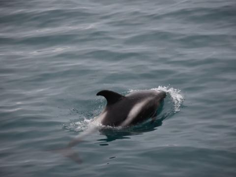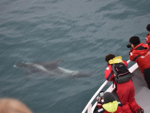 Report from Elding: What a wonderfull evening with whales, dolphins and live music. We kept dry in our overalls in the light rain and enjyed sailing in smooth sea conditions. Minke whales were seen throughout the whole tour, we got good looks at few of them although we never followed them around. The reason for that was the great sightings of 2 pods of white beaked dolphins, at least 12-13 individuals and 2 humpback whales that stole our attention. Our first pod of dolphins approached the boat, swam all around us, so we could see their whole bodies, from snout to tail. While following them we noticed a humpback further out that was being followed by another pod of white beaked dolphins! It seemed that the hupback was a bit bothered by their company, lob tailing and forming loud noises while exhailing! The dolphins followed the humpbk for a while but when they left it the humpback changed behavoir, became more relaxed and dived for longer. Right before we started heading back we found another humpback. We saw even more minke whales on the way back, there must have been at least 7 individuals in total over the whole tour.