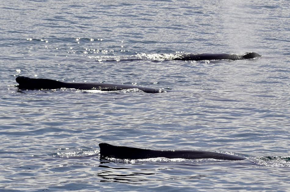 Report from Hafsulan: We started out this morning with a spectacular tour! In total we had about 10 minke whales (2 feeding together, the rest solitary), and 7 humpback whales (4 feeding together, and mother and calf pair). With calm seas and plenty of sunshine we set out. On our way out we had two minke whales feeding together! They gave us plenty of surface sequences which was wonderful. We then left them to feed and made our way farther out into the bay. It was a minke madness with minke whales popping up left and right; so many that we would not have made it too far out into the bay if we did not admire them on the go! In the distance we saw a bundle of powerful blows and so we went to investigate. We came across three humpback whales feeding together and a fourth humpback whale not too far away feeding alone. One of our three ´waved´ to us as we approached with many pectoral slaps. They then started to roll! Our three even approached the boat and checked us out! It was amazing to see clearly through the water their entire bodies! The fun was not over yet, as we spotted two more dorsal fins in the distance. When we came closer it appeared we had been very lucky as we had a very rare site for our feeding ground. We had come across a mother and calf pair! Usually pairs separate when they reach the feeding grounds so a very enjoyable find. They even came nice and close to the boat which was more than we could ever ask for! When we waved our mum and calf pair goodbye we came across one breaching humpback whale! What a way to end our tour. After some breaching it was time to make our way back into port. This was a fantastic way to start the morning.