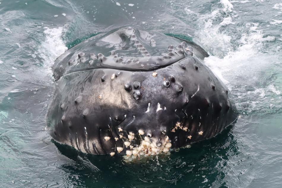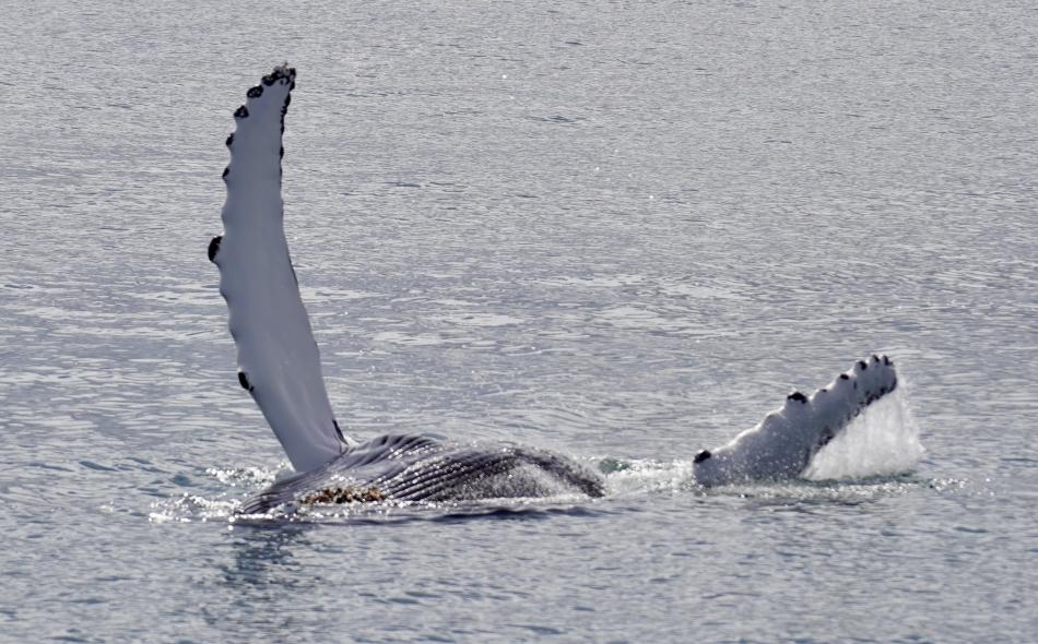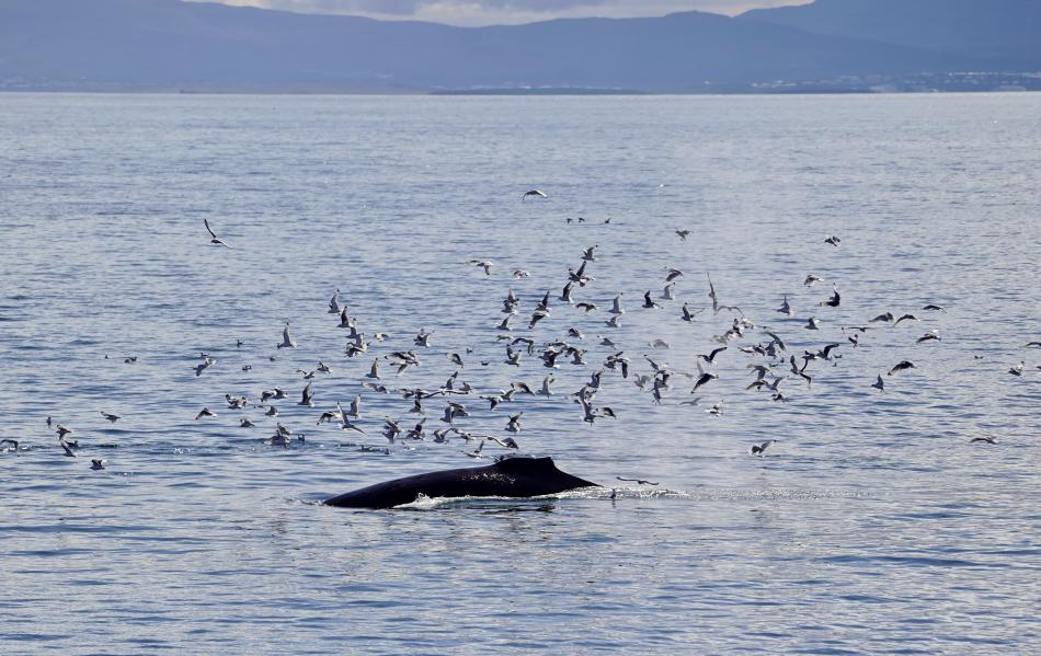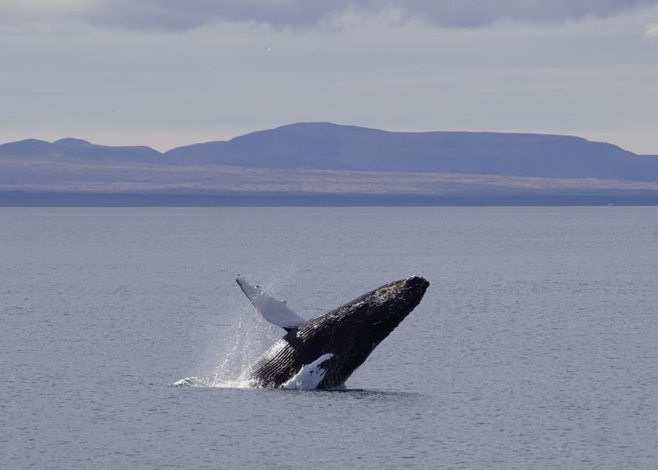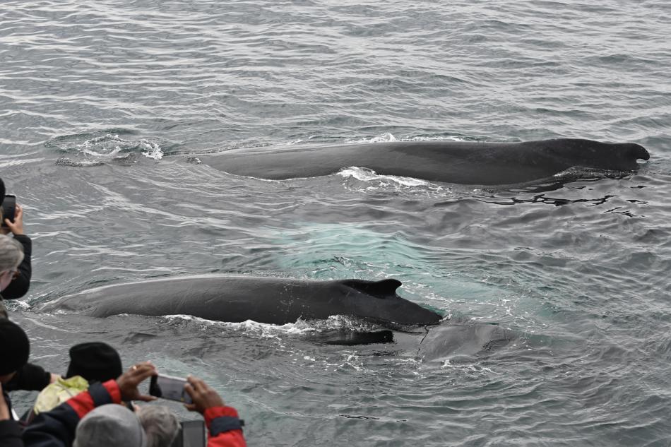 Report from Elding: Continuing the spectacular tours we have had over the past week, this afternoon treated us to some up close and personal experiences with our larger baleen whale species. As we sailed out under overcast skies and great visibility, it did not take long before we spotted the first whale of the tour, a fast swimming minke whale passing by in the direction we were heading. It surfaced a couple of times, and we continued on in the search of more encounters. Not long after, a blow of a humpback whale appeared in front of us. Excitement grew on board, but little did we know that blows of humpbacks would soon appear all around us in this active feeding area. There must have been at least 6 solitary individuals around this tour. We spent some time observing our first individual, and then moved on. Soon, we came upon a mother and calf pair that had been sighted earlier in the week. We shut off the engines, and to our delight, they came right up to the boat. The mother let out a series of loud blows, and the young one mimicked her blows, did some spy hopping, and rolling playfully at the surface. After giving them space to rest, we moved on and quickly encountered even more humpback whales this time, a group of three individuals feeding and travelling together. As they performed synchronized deep dives, they surprised us by surfacing right next to our boat, all exhaling at the same time. A magical and unexpected moment! On our way back we made a brief stop by the mother and calf again. They still seemed curious about us and stayed close as we once more shut off the engines. As we continued to the harbor, we spotted more minke whales in the disance, we spotted at least 10 far away during the tour. Everyone on board was moved by the incredible encounters we had. The bay is truly treating us to some unforgettable tours!