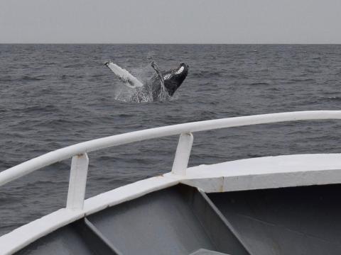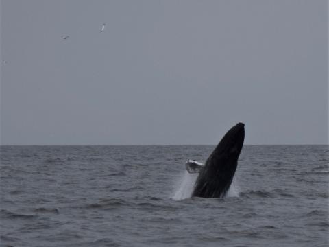 The weather was grey and rainy as we left the harbour but we didn´t let the weather dampen our spirits. After half an hour of sailing we came accross a minke whale. This particular individual was very shy so didn´t stay for long. Furhter out at sea, after having searched different areas, we had an incredible encounter: Two humpback whales were feeding together, with a pod of white-beaked dolphins (15 to 20 individuals) in the same spot. It was wonderful to see the humpback whales lunge feeding in synchronity while white-beaked dolphins jumped around and northern gannets circle the whole scene from above. On our way back to Reykjavík we saw in the distance behind us splashes from one of the humpback whale breeching. Overall an amazing trip!