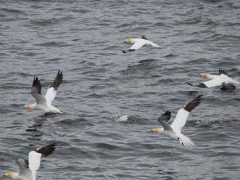 Report from Hafsúlan: The morning gave us a very entertaining show and with more excellent weather our spirits were very high this fine afternoon. More perfectly calm ocean and warm wind, even a tour without sightings would have been enjoyable. But we had some great sightings anyway! On our way to the same area we saw the whales this morning we found a different species, we found White Beaked Dolphins! It was a small pod of just 3 dolphins but they were travelling slowly and so we got a great look at their black and white striped bodies before we moved on to search for something else. As we sailed further out we came across several small pods of 2-3 Harbour Porpoises, more searching gave us what we wanted. A Minke Whale! It was a single minke whale that was surrounded by a huge flock of Northern Gannets that were diving into the water all around us. The minke was feeding too, it even lunge fed at the surface of the water! It was curious too, taking a look at all the boats in the area and coming within metres of us. Though it was just one whale it gave us everything we wanted and more and it was a pleasure to watch this minke today.