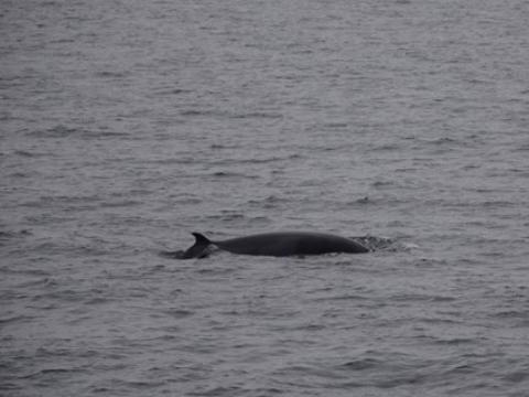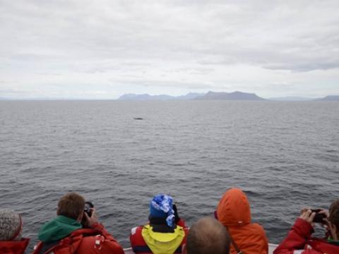 Report from Hafsúlan: The wind was calming down in the afternoon and some of the cloud cover lifted when we 'set sails'. Our first minke whale was visible from far away and upon approach was peacefully surfacing close to the boat. However, it changed direction quite frequently and unpredictably, making it so much more exciting, when the whale suddenly surfaced only 20 meters from the boat. The blow was clearly audible in those cases and twice the whale was so close one could make out the white stripes on the minke´s pectoral fins. We assumed there were more minke whales around us, and in fact, two more showed themselves while we were watching the first one. At least one of the others was coming close, too. After we had spend a fantastic 45 minutes with these whales, we wanted to look for something else. We didn´t have to search for long, when we saw a small pod (2) of white-beaked dolphins (and two more minke whales on the way). The dolphins, however, were traveling and didn´t seem in a 'human-watching' mood. In summary, another excellent whale watching tour.