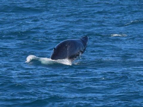 Report from Elding: The wind had picked up but the weather was still amazing on our way out with the sun beaming down on us. We were fortunate enough to have a quick encounter with with some white-beaked dolphins which were pretty amazing. After searching fruitlessly for a while we were a little worried but we were soon rewarded on our slow return by the sight of a couple of blows. Pausing, we had the most amazing encounter. A minke whale started breaching in front of us. Minke whales rarely breach - this whale breached at least 25 times! We were so excited we were literally falling over ourselves in the guiding box, and I was screaming into the microphone. This whale was ridiculous, we were actually checking and rechecking as it came up, disbelieving that it was really a minke whale. It was fantastic, I completely lost it. Hands down one of the best trips ever, we were all giggling like little children on the way back, including the actual children.