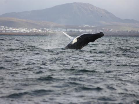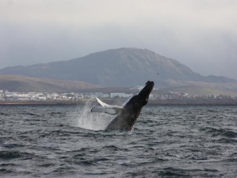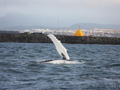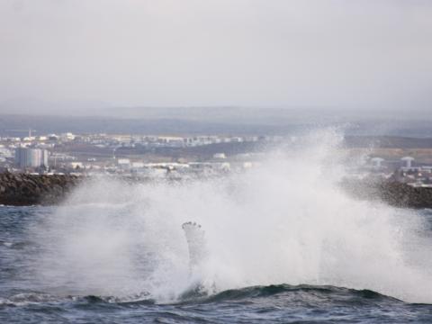 Report from Eldey: We sailed out again this afternoon hoping for the wind to calm down and hoping for some whales or dolphins to show up. Our expectations were not the highest after the morning tour, however, after about an hour we saw a humpback whale! It took a while for us to get a better look at it and it stayed underwater for quite a while inbetween dives. After some time our patience was rewarded and we finally got to see a nice fluke-up as the whale was raising its tail above to water surface. After we were sure that everyone had gotten a good look at this individual, we left the area to keep searching for animals. We didn't have much more time on this tour, therefore we soon decided to get another look at the humpback whale before heading back to the harbour. When we approached the animal, we soon noticed that it was two humpback whales this time surfacing together. When we got closer we had to wait for them to come up again - it was totally worth it. Next time they came up, one of the humpbacks was jumping out of the water! Not just once, but 7-8 times it came with most of its body out of the water and turned in the air before falling back into the water. After the jumpings, it rolled on the side and slapped on of its pectoral fins repeatedly on the water surface. What an amazing end of the tout! We saw the two humpies come up a few more times but then turned back to Reykjavik with a lot of happy passenger.